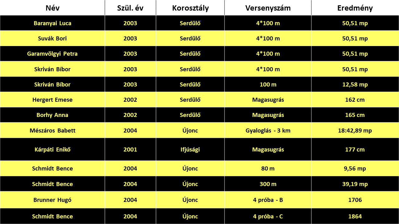 - Erát Kristóf 1 alkalommal, Farkas Bence 4 alkalommal futott a korosztályos 4×100 m-es válogatott váltóval felkészülési versenyen